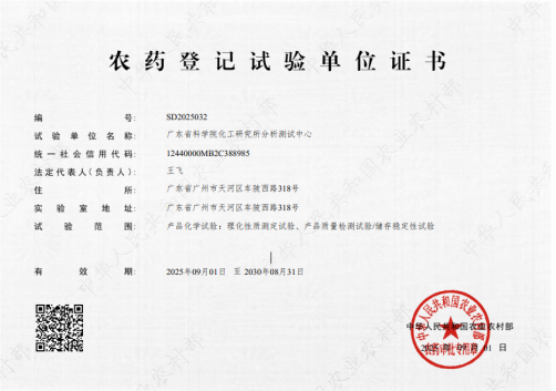 近日,广东省科学院化工研究所分析测试中心顺利通过了农业农村部农药登记试验单位资质认定,取得农业农村部颁发的“农药登记试验单位资质认定证书”(证书编号:SD2025032),试验范围为产品化学试验(理化性质测定试验、产品质量检测试验/储存稳定性试验)。 化工研究所分析测试中心(广东省质量监督化肥农药检验站)长期承担农药检验工作,自上世纪80年代起,就取得了涵盖农药检验的计量认证资质。为提升中心农药检验能力,扩大服务范围,分析测试中心于去年开始全面启动了农药登记试验单位资质认定准备工作,并于今年9月1日正式获得农业农村部颁发的资...